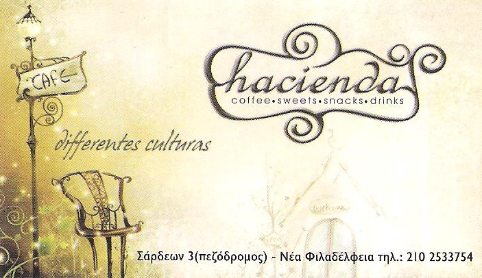 Αν θέλετε να απολαύσετε τον καφέ σας, την μπύρα σας, το γλυκό σας, το κοκτέιλ σας αλλά και την ποικιλία σας σε ένα πολύχρωμο, άνετο, εντυπωσιακό περιβάλλον με έναν υπέροχο αίθριο χώρο με γυάλινη οροφή και τραπεζάκια έξω στον πεζόδρομο τότε δεν έχετε παρά να επισκεφτείτε το "Hacienda" στην Νέα Φιλαδέλφεια!